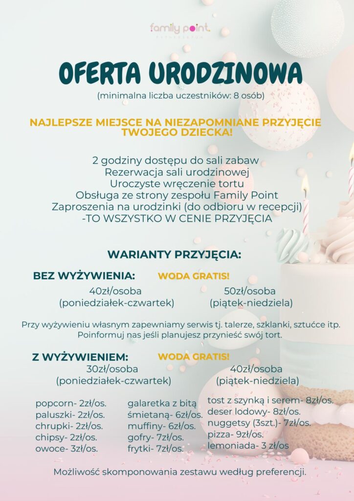 Urodziny to najważniejszy dzień w roku każdego dziecka (i nie tylko ☺) w związku z czym chcemy dołożyć wszelkich starań, aby ten dzień był dla Twojej pociechy niezapomnianym przeżyciem, które będzie wspominane przez Was do następnych urodzin. Organizacja takiego wydarzenia to dla nas czysta przyjemność, a radość i uśmiech na twarzy dziecka jest największą nagrodą. Organizując urodziny w Family Point masz pewność, że Twoje dziecko nie będzie się nudzić, a Ty odpoczniesz w towarzystwie przyjaciół przy filiżance pysznej kawy.
